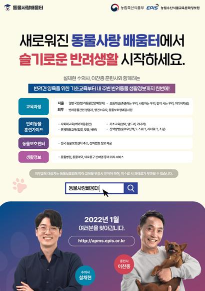 농림축산식품부는 성숙한 동물보호·복지 문화를 조성하고 동물보호 인식을 높이고자 대국민 온라인 교육 플랫폼인 ‘동물사랑배움터’를 1월 17일에 오픈한다.