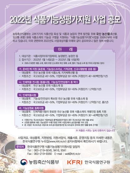 농림축산식품부는 고부가가치 식품산업 육성 및 식품과 농업의 연계 발전을 위해 국산 농산물 유래 식품소재의 기능성 구명을 지원하는 '2022년도 식품기능성평가 지원사업'의 사업대상자를 모집한다.