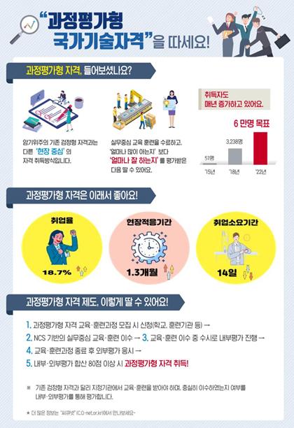 ‘과정평가형 국가기술자격’은 실무중심 교육·훈련과정 이수 후 평가를 거쳐 합격기준을 충족한 사람에게 국가기술자격을 부여하는 제도로, 2015년 첫 시행 이후 참여자 및 취득자가 크게 늘고 있으며 과정평가형 자격을 취득하고 채용된 이들이 현장 실무에 비교적 빠르게 적응하고 있어 기업에서도 긍정적인 평가를 받고 있다.