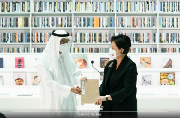 김정숙 여사는 1월 16일 UAE 순방 첫 행사로, 중동 최대 규모의 ‘모하메드 빈 라시드(MBR) 도서관’에서 열린 ‘한-UAE 지식문화 교류식’에 참석했다. 한국의 문화와 역사를 알리는 250여 권의 도서를 기증하고, 이번 교류식을 계기로 특별히 한국 국립중앙도서관과 MBR 도서관이 지식문화 교류 MOU를 체결하기 위해 마련된 자리다.