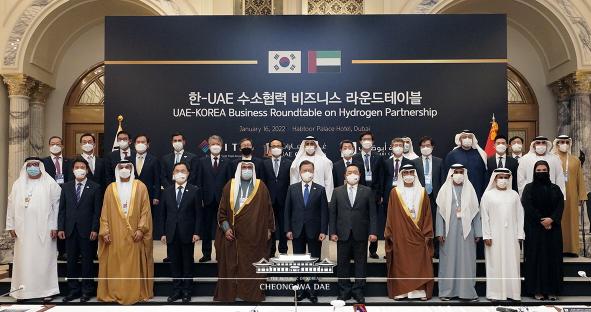 이어 문 대통령은 "한국 역시 세계 최초로 수소법을 제정하고, 수소경제 기본계획을 수립하여 생산, 활용, 유통 등 전 주기에 걸친 수소경제 생태계를 강화하고 있다"고 말한 뒤, 한국의 대표적 기업 10곳의 수소 분야 투자를 설명하며 "그린 수소와 블루 수소의 생산에 강점을 가진 UAE와 수소차와 충전소, 연료전지, 액화운송 등 수소의 활용과 저장, 유통에 강점을 가진 한국이 서로 협력하면 양국은 수소경제를 선도하게 될 것"이라고 강조했다.