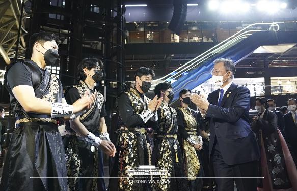 문 대통령은 “이곳 두바이에서 한국의 혁신기술과 문화를 알리는 여러분들의 노력이 유치 성공의 밑거름이 될 것”이라며 “부산 엑스포 유치 성공을 위해 마음을 하나로 모아나가길 바란다”면서 관계자들에게 박수를 보냈다.