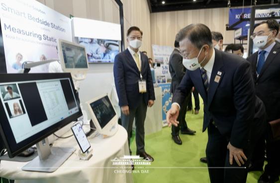 이날 문 대통령은 유정열 대한무역투자진흥공사(KOTRA) 사장과 함께 한식홍보 부스, 세이프웨어 부스, 헬스커넥트 부스, 삼성전자 부스, 현대기아차 부스, 부산월드엑스포 홍보부스를 차례로 둘러보았다.