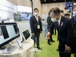 이어 문 대통령은 산업용 스마트 추락보호복을 판매하는 세이프웨어 부스에서 "산재 사망사고가 줄어들고는 있는데, 그 가운데 건설 현장의 추락사고가 줄지 않고 있다"며 "추락사고 날 때마다 기필코 막아야 하는데, 초기 수요가 있어야 할 텐데, 공공 분야에서 많이 지원해야겠다"고 말했다.