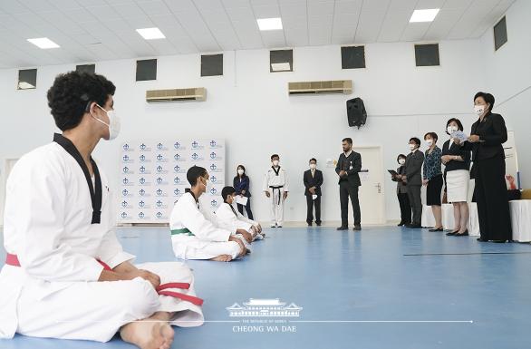 이어 아이들이 준비한 열정적인 태권도 수업을 참관한 뒤, 김정숙 여사는 아프라, 압바스 두 친구에게 직접 준비한 태권도 파란띠를 매어줬다. 띠가 생각만큼 예쁘게 잘 안 매어지자, 김정숙 여사는 무릎까지 꿇고 다시 한번 찬찬히 띠를 매어주었다.
