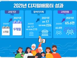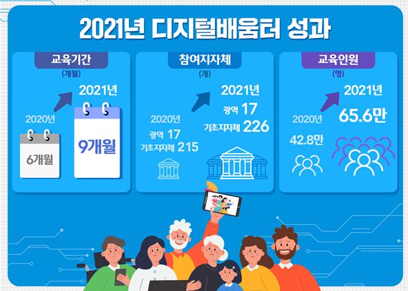 2021년에는 17개 광역?226개 기초지자체가 전체 참여하여 전국 1,000여개소의 디지털배움터를 운영하였으며, 65.6만명이 교육을 받았다.