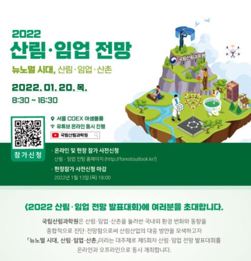 산림청 국립산림과학원은 산림의 가치를 높이고 임업·산촌의 발전 방향을 논의하는 '2022 산림·임업 전망발표 대회'를 20일 오전 9시 30분부터 오후 4시 30분까지 온라인과 오프라인(코엑스 아셈볼룸)으로 동시 진행한다.