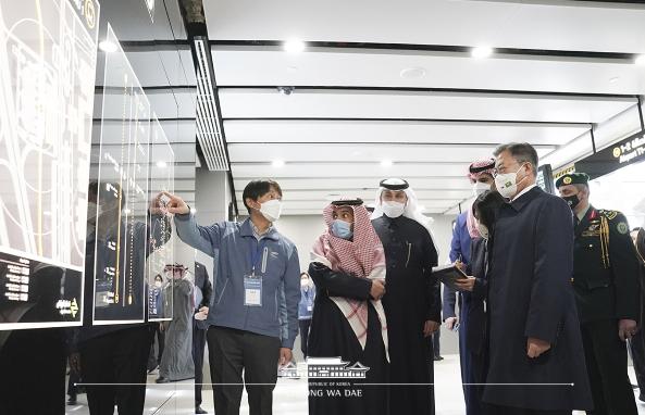 문 대통령은 “사우디는 우리나라 건설이 중동지역에서 가장 먼저 진출하고, 가장 많은 시공을 해 ‘제1차 중동 건설붐’이라 불렀던 곳”이라며 “그런데 지금 프로젝트는 과거 단순 시공 하청을 넘어서 고부가가치, 고품질 프로젝트로 대한민국 건설의 새로운 경지를 보여주고 있다”고 감탄했다.