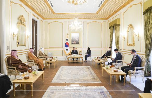 문 대통령은 이날 "한국은 전체 원유수입량 61%를 GCC 회원국으로부터 공급받고 있으며, GCC의 주요 인프라 건설에 한국의 우수한 건설기업들이 참여하고 있다"고 밝힌 뒤 "양측의 협력은 이제 보건·의료, 과학·기술, 국방·안보, ICT와 지재권 등 다양한 분야로 확대되고 있다"며 이같이 말했다. 문 대통령은 “오늘의 만남을 통해 양측 공동 번영을 위한 미래 협력 기반이 더욱 단단하게 구축되길 바란다”고 덧붙였다.