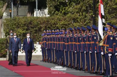 카이로의 대통령궁 정원에서 열린 공식환영식에서 문 대통령 부부는 이집트 압델 파타 알시시 대통령 부부의 환영을 받으며 행사장으로 입장했다.