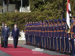 양 정상은 양국 국가 연주를 들은 뒤, 의장대장의 안내에 따라 의장대를 사열했습니다. 이어 이집트 측 환영인사와 우리측 수행원이 차례로 인사를 나누었다.