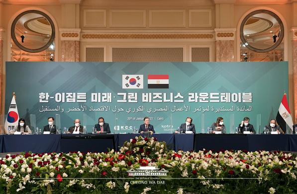 문재인 대통령은 21일 오후(현지시각) 한-이집트 정부기관과 기업인 40여 명이 모인 ‘한-이집트 미래·그린 비즈니스 라운드테이블’에 참석, 지금까지의 양국 경제협력을 평가하고 이후 친환경과 디지털전환 등 미래산업 분야에서의 협력 확대를 당부했다.