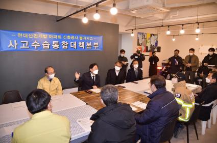 박범계 법무부장관은 광주고검장, 광주지검장과 함께 1.21일 광주 화정동 아이파크 아파트 외벽 붕괴사고 현장을 방문하여 실종자 가족들을 위로하는 한편, 사고의 정확한 원인, 기업 및 작업관계자의 책임소재를 신속하고 명확히 규명하여 엄정 대응할 필요성을 강조했다.
