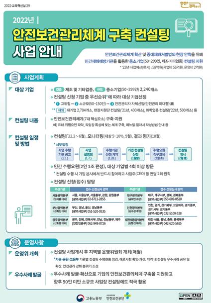 컨설팅 받기를 희망하는 기업은 다음 달 2월 15일까지 컨설팅을 수행하는 기관이나 안전보건공단 광역본부, 중소기업중앙회*에 신청하면 2월부터 컨설팅을 받을 수 있다.