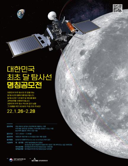 과학기술정보통신부는 한국항공우주연구원과 함께 대한민국 최초 우주탐사선인 달 탐사선(궤도선)의 이름을 정하기 위한 대국민 명칭공모전을 1월 26일 오전 10시부터 2월 28일 오후 6시까지 실시한다고 밝혔다.