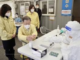 문재인 대통령은 1월30일 안성휴게소 고속도로 임시선별검사소를 방문하여 설 연휴 기간 의료·검사체계 개편의 시행 상황을 점검하고 방역진·의료진의 노고를 격려했다.
