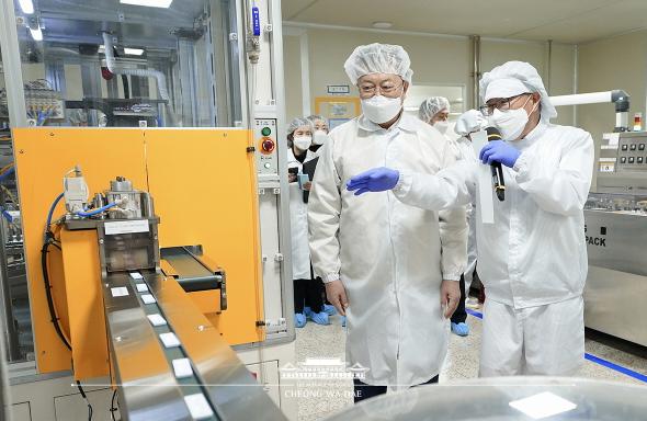 문재인 대통령은 1월 30일 SD바이오센서 오송공장에 방문하여 자가검사키트 생산 현장을 둘러보고 현장 근무자들을 격려했다.