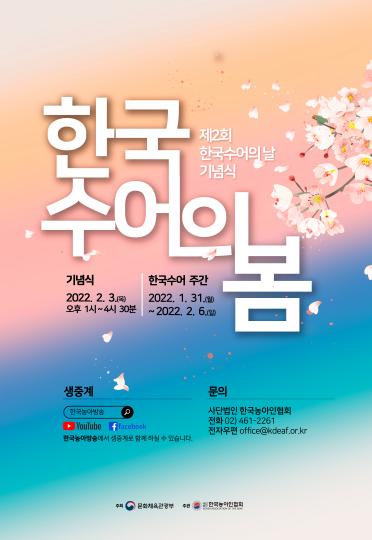 문화체육관광부는 사단법인 한국농아인협회와 함께 2월 3일 오후 1시 서울 한국컨퍼런스센터 대강당에서 ‘제2회 한국수어의 날’ 기념식을 개최한다. 이번 기념식은 코로나19 예방을 위해 현장 참석자를 최소화하고 비대면 방식으로 진행한다.