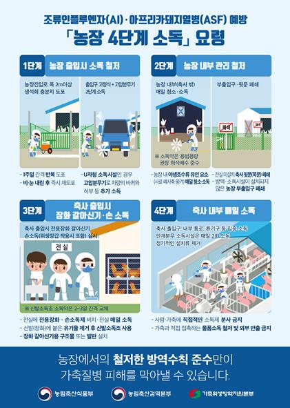 중수본은 “설 연휴 기간 중 차량과 사람의 이동이 증가함에 따라 연휴 직후 ‘전국 일제 소독의 날’로 지정한 2월 3일(목), 농장·축산 관계시설 및 축산차량에 대한 집중소독에 적극 동참해 줄 것”을 요청하였다.