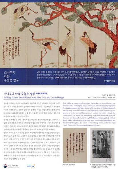 문화재청 국립고궁박물관은 2월의 ’큐레이터 추천 왕실 유물‘인 ‘소나무와 학을 수놓은 자수 병풍’을 박물관 1층 상설전시장 ’대한제국‘실에서 소개하고, 2월 3일부터 문화재청과 국립고궁박물관 유튜브에서 온라인 공개한다.
