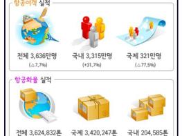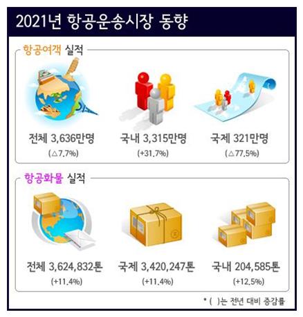 국토교통부는 ’21년 항공여객이 전년 대비 7.7% 감소한 3,636만 명으로, 국제선 여객은 전년 대비 77.5% 감소(’19년 대비 96.4% 감소)한 321만 명을, 국내선 여객은 전년 대비 31.7% 증가(’19년 대비 0.5% 증가)한 3,315만 명을 기록하였다고 밝혔다.