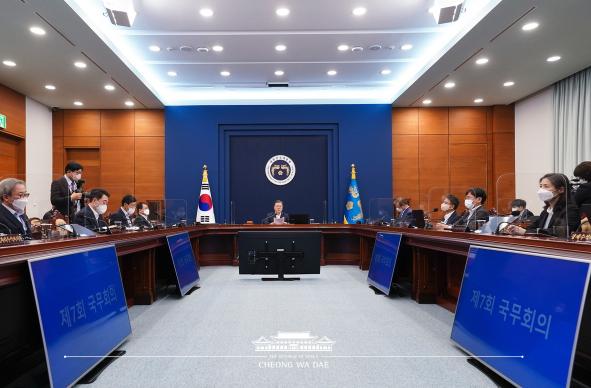 문재인 대통령은 오늘 오전 10시 청와대에서 정부서울청사·세종청사와 영상회의로 열린 제7회 국무회의를 주재했다. '조세특례제한법 시행령 일부개정령안' 등 대통령령안 37건 및 일반안건인 '대한민국 정부와 성평등과 여성의 역량강화를 위한 국제연합기구 간의 국제연합여성기구 성평등전문센터의 대한민국 내 운영에 관한 교환각서안', 보고안건인 '중소기업 옴부즈만 2021년도 활동결과'를 심의·의결했다.