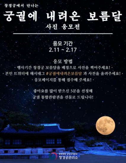 최종 결과는 2월 25일 창경궁관리소 누리집에서 발표한다. 자세한 응모방법은 창경궁관리소 트위터를 방문하여 확인하면 된다.