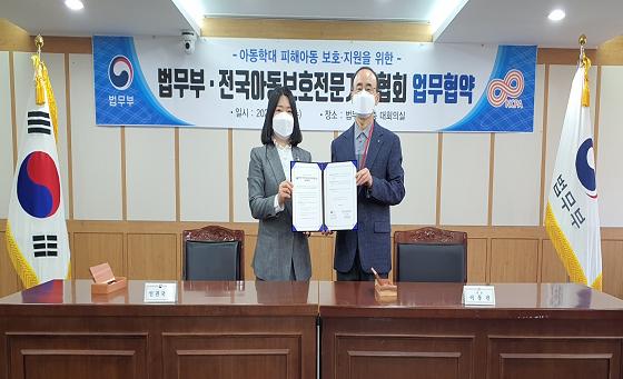 법무부와 전국아동보호전문기관협회는 아동학대 피해아동 보호를 강화할 수 있도록 피해자 국선전담변호사와 아동보호전문기관의 협업방안을 구체화하기 위해, 2022.2.9. 11:00, 법무부 대회의실에서 업무협약식을 개최했다.