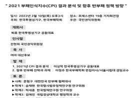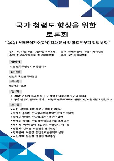 이번 토론회에서는 2021년 국가청렴도(CPI) 결과 분석과 향후 반부패전략 및 과제를 중심으로 발제와 토론이 진행됐다.