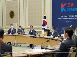 문 대통령은 간담회 모두발언에서 “전 세계적인 팬데믹 상황에서도 한국은 봉쇄조치 없이 물류와 인력의 이동의 안정성을 보장하는 개방적 경제를 유지했다”며 “그에 힘입어 한국은 코로나 속에서도 주요국 중 경제 타격이 가장 적었고, 빠르고 강한 회복세를 보이며 높은 국가신용등급 속에서 안정적인 투자처로 입지를 굳건히 하고 있다”고 말했다.