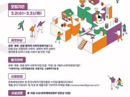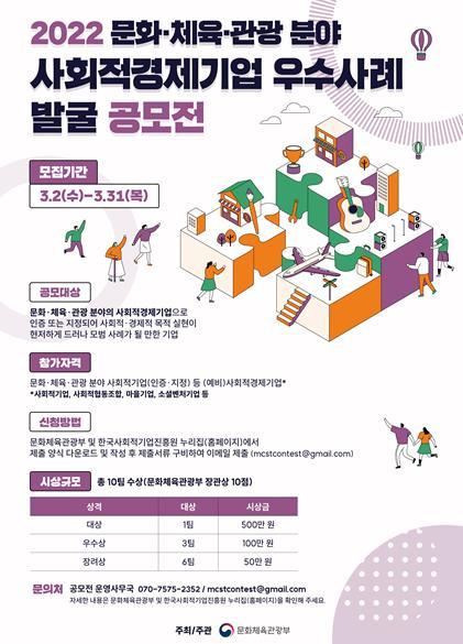 문화체육관광부는 3월 2일부터 31일까지, 문화·체육·관광 분야에서 혁신적인 경영모델을 바탕으로 사회적 가치를 실현하고 있는 우수한 사회적경제 기업을 찾기 위해 공모전을 개최한다.