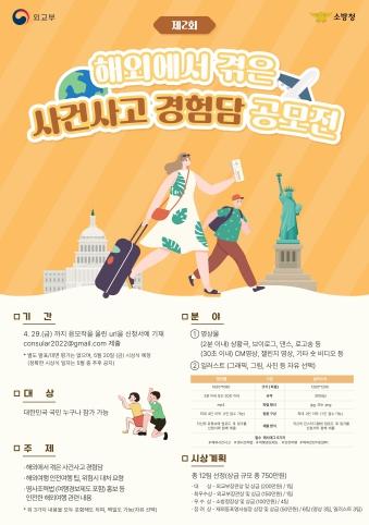 외교부는 '재외국민보호를 위한 영사조력법' 및 '여행경보제도'에 대한 홍보와 해외 사건·사고 예방 및 대처법 소개를 위해 작년에 이어 올해도 소방청과 함께 ‘제2회 해외에서 겪은 사건사고 경험담 공모전’을 3.2-4.29. 동안 개최한다.