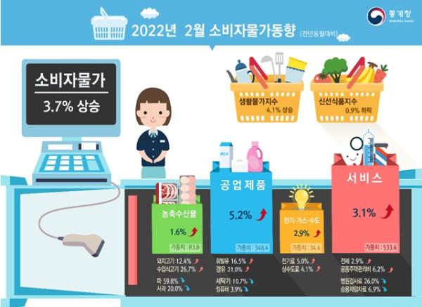 2월?소비자물가지수는?전월대비?0.6%,?전년동월대비?3.7%?각각?상승했다.