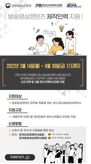3월 14일부터 코로나19 장기화로 어려움을 겪고 있는 중소 방송영상 제작사들의 사업 참여 신청을 받는다. 지원 대상으로 선정되면 작가, 연출, 조명?음향?촬영 제작진 등 방송영상 제작 업무에 참여하는 종사자에 대해 1인당 월 180만 원, 최장 6개월간의 인건비를 최대 10명까지 지원받을 수 있다.
