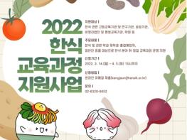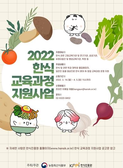 농림축산식품부와 한식진흥원은 ‘2022년 한식 교육과정 지원사업’ 대상 기관을 3월 14일부터 4월 5일까지 모집한다고 밝혔다.