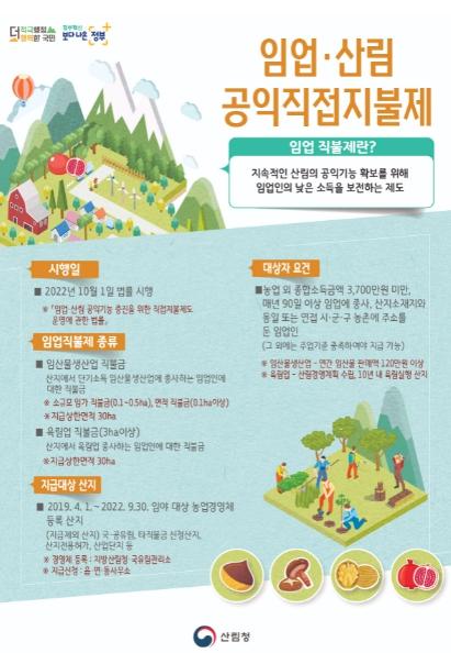 임업직불제는 임업인의 소득안정과 산림의 공익기능을 증진하기 위해 임산물생산업과 육림업에 종사하는 임업인에게 이행준수 의무를 부여하고, 일정한 기준에 따라 직불금을 지급하는 제도이다.