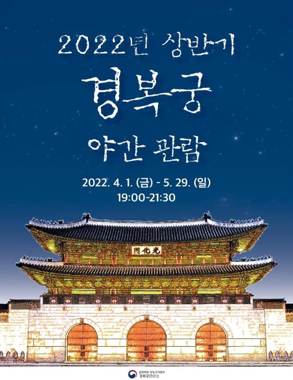 문화재청 궁능유적본부 경복궁관리소는 2022년 상반기 경복궁 야간 관람을 4월 1일부터 5월 29일의 기간 중 38일간 개최한다.