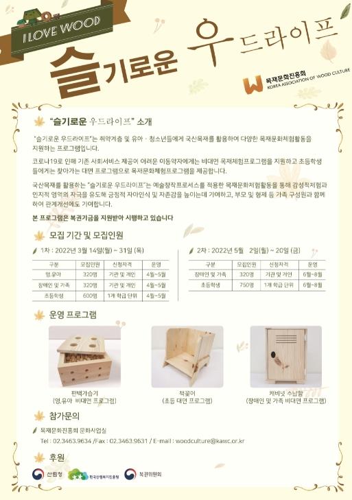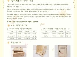 이번 ‘슬기로운 우드라이프’는 1차(3.14∼31)와 2차(5.2∼20) 참가 신청을 통해 약 2,310명의 참가자를 모집한다. 자세한 사항은 목재문화진흥회 누리집를 통해 확인하고 접수하면 된다.
