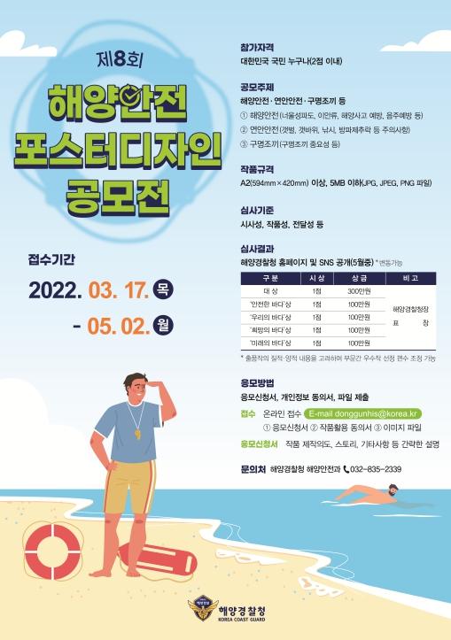해양경찰청은 3월 17일부터 5월 2일까지 ?제8회 해양안전 포스터 디자인 공모전?을 개최한다고 밝혔다.