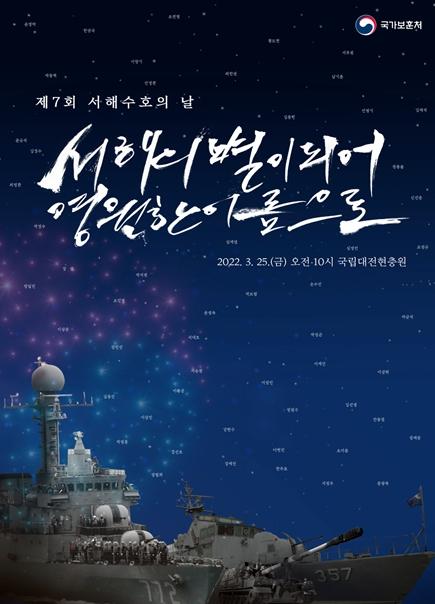 국가보훈처는 오는 25일 오전 10시, 국립대전현충원(현충탑 참배마당)에서 서해수호 55용사 전사자 유가족, 참전 장병과 정부 주요인사 등 250여 명이 참석한 가운데 ‘제7회 서해수호의 날 기념식’을 거행한다고 밝혔다.