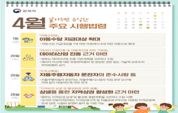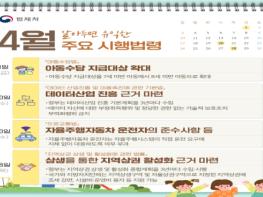 법제처는 4월에 총 98개의 법령이 새로 시행된다고 밝혔다. 주요 시행법령의 내용과 시행일은 다음과 같다.