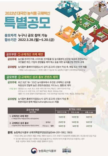 농림축산식품부는 수요자 및 현장 중심의 규제개선으로 국민 체감도를 높이기 위해 3월 28일부터 5월 20일까지 '2022년 농식품 분야 규제혁신 특별공모'를 개최한다.