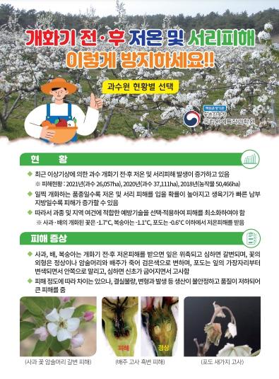 ??최근 기후변화 등의 요인으로 매년 봄철 농작물 저온피해가 발생하고 있는데 대부분의 피해는 4월 중 꽃샘추위로 인한 과수의 꽃눈·꽃씨방 갈변 등에 집중되는 추세이다. 지난해에는 전국 저온피해 27,716ha 중 과수가 26,057ha였고, 세부 품목으로는 사과 16,452ha, 배 4,128ha, 복숭아 2,337ha, 자두 1,887ha, 단감 401ha 순이었다.