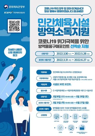 문화체육관광부는 국민체육진흥공단과 함께 3월 30일(수)부터 코로나19로 어려움을 겪고 있는 체육시설업계의 방역·소독을 지원하기 위해 민간 체육시설 3만 5천 개소를 선착순으로 모집한다.