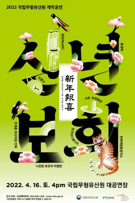 문화재청 국립무형유산원(원장 이경훈)은 4월 16일 오후 4시 국립무형유산원 얼쑤마루 대공연장에서 2022 국립무형유산원 개막공연 '신년보희(新年報喜)'를 진행한다.