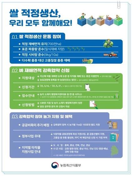 농촌진흥청과 지방농촌진흥기관은 올해 쌀 적정 생산 목표인 70만 헥타르 달성과 논 타 작물 재배 전환을 위해 △농업인 교육과 기술지원 △논에 벼 대신 심을 수 있는 식량작물?밭작물?채소 작부체계(재배순서) 보급 △농산물의 판로 확보 지원을 추진한다.
