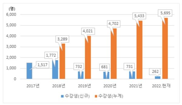 ?'종자산업법'에 따라 육묘업을 하려는 경우에는 전문인력 양성기관*에서 실시하는 교육을 16시간 이상 이수하고, 육묘업 시설 기준을 갖추어 해당 지자체에 등록하여야 한다. 2017년부터 지난해까지 육묘업 신규 등록자 교육을 수강한 농업인은 5,433명으로 연평균 1,087명 수준이다.
