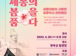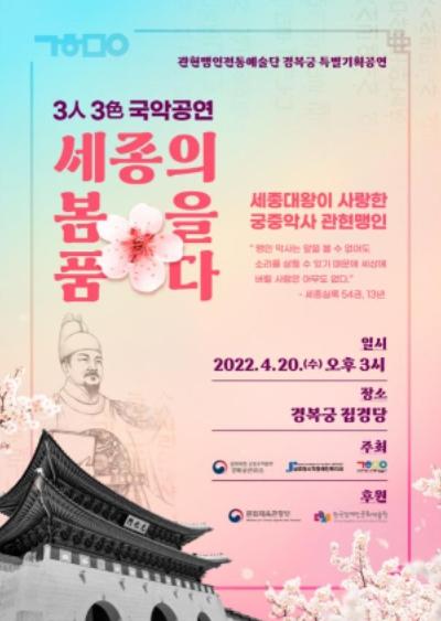 문화재청 궁능유적본부 경복궁관리소(소장 최재혁)와 실로암시각장애인복지회(이사장 김선태)는 4월 20일 장애인의 날을 맞이하여 당일 오후 3시 경복궁 내 집경당에서「관현맹인전통예술단」의 경복궁 특별기획공연 ‘3인 3색 세종의 봄을 품다’를 개최한다.
