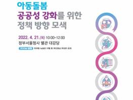 대통령 직속 저출산·고령사회위원회는 4월 21일(목) 오전 10시 정부서울청사 별관 대강당에서 '아동돌봄 공공성 강화를 위한 정책 방향 모색'을 주제로 아동돌봄 정책포럼을 개최한다.