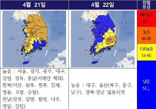 또한 강원과 영남 등 동쪽 대부분 지역을 비롯해 수도권과 충청 내륙, 호남 일부에 건조특보가 발효되고, 전국 대부분지역의 산불발생 평균 위험지수가 ‘높음’ 단계이므로 각별한 주의가 요구된다.